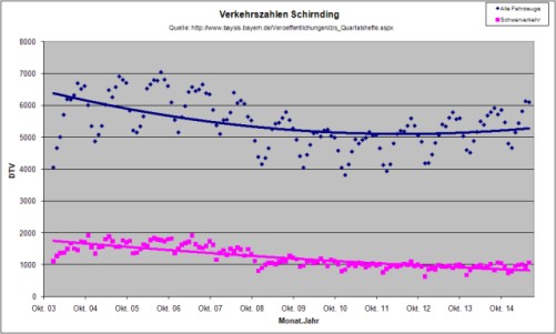 Auf allen Straßen Bayerns gibt es seit etwa 2002 keine signifikante Zunahme der Verkehrsstärke. (Berichte zum Verkehrs- und Unfallgeschehen für 2012 - aktuelleste Version).